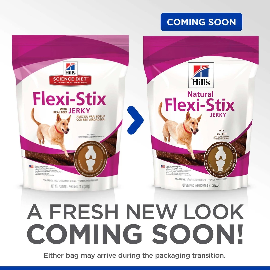 Hill’s Science Diet Flexi-Stix Jerky with Real Beef Dog Treats are delicious, natural and made with added Glucosamine and Chondroitin for daily support of healthy joints. The stick shape is easy to break into pieces and the rich meaty flavor will make your dog happy. No artificial colors, flavors or preservatives.
