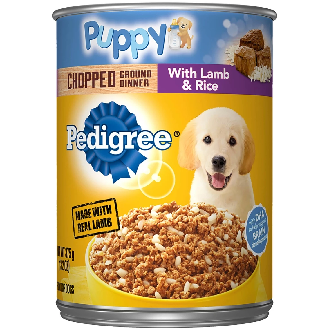 Pedigree puppy food is formulated with DHA to help support brain development. Made with real chicken and beef for an irresistible taste dogs will love. Pedigree puppy canned wet dog food is 100% complete & balanced. Pedigree chopped ground dinner dog food is made in the USA with the world’s finest ingredients. Hearty, meaty recipes provide a soft texture for flavor and variety.