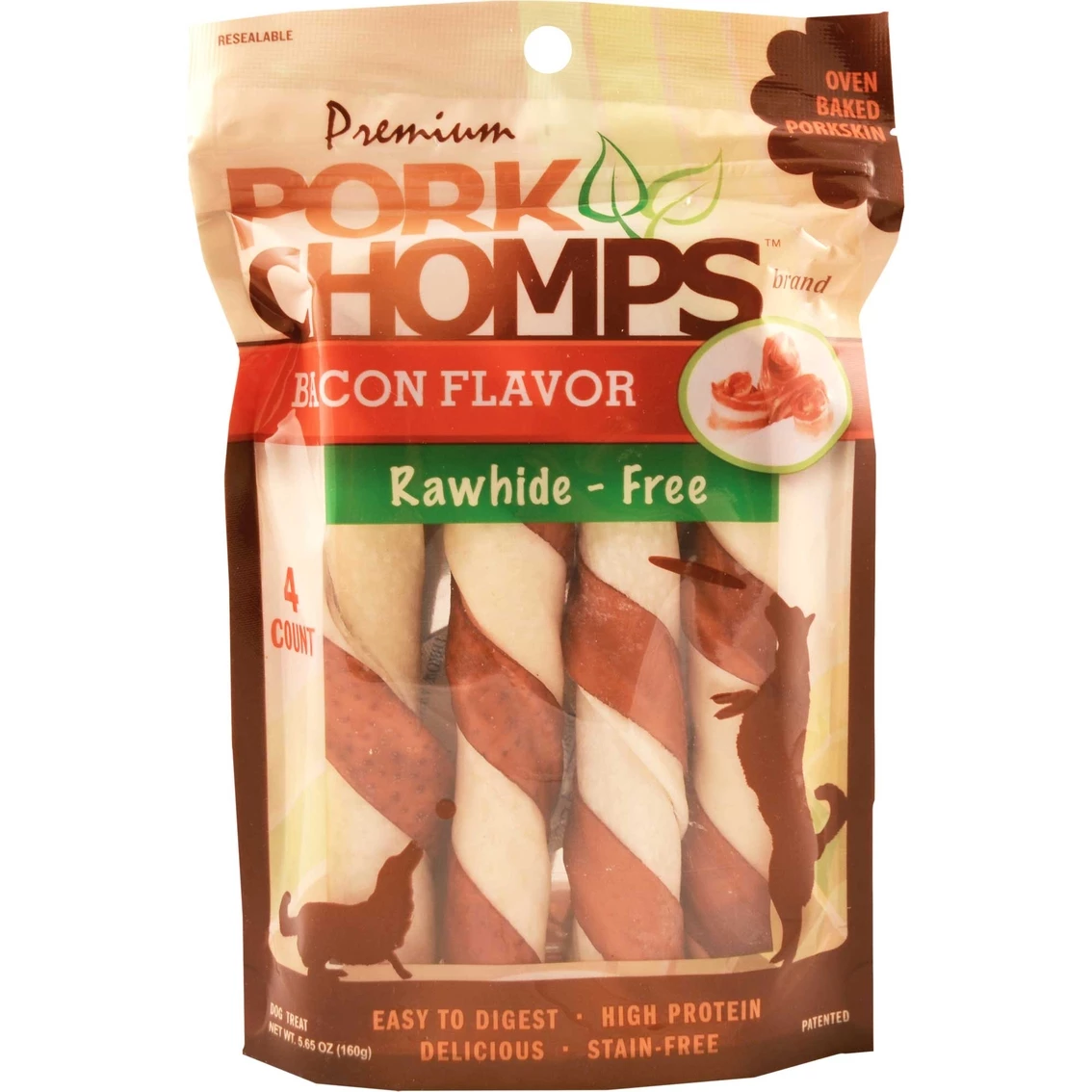 Premium Pork Chomps Bacon Flavor Twists are lower in fat than pig ears and more easily digestible than beef rawhide. These treats are wonderfully safe and wholesome. The 4 ct. twists come in a reusable bag.